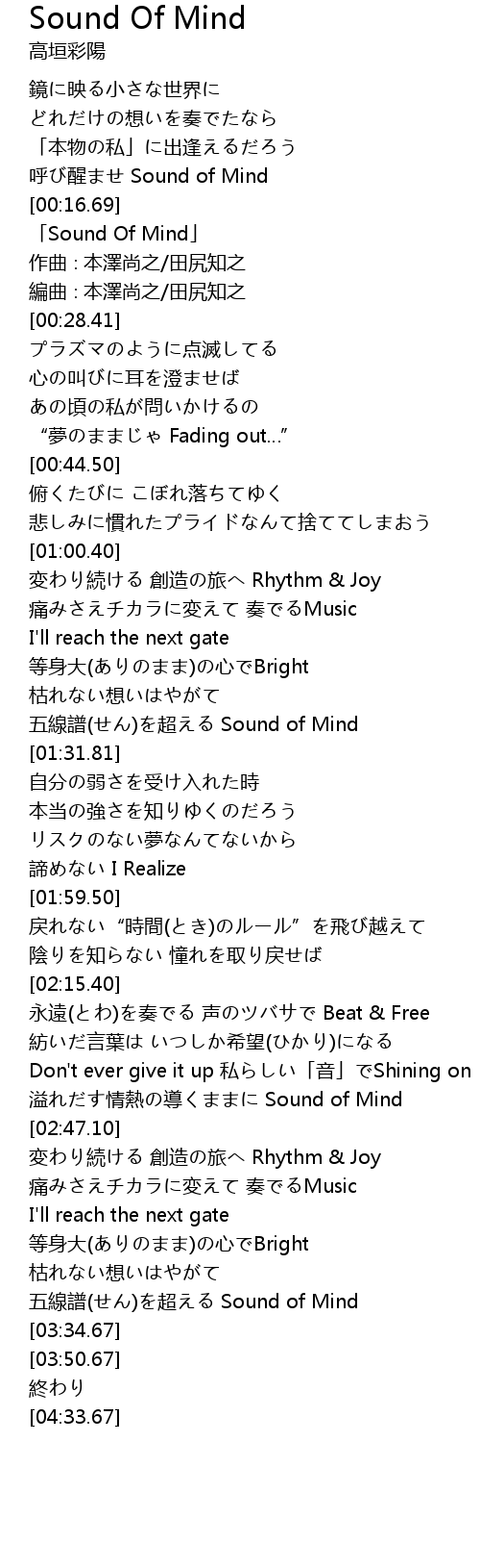 | [02:38.12] | 溢れだす情熱の導くままに Sound of Mind |