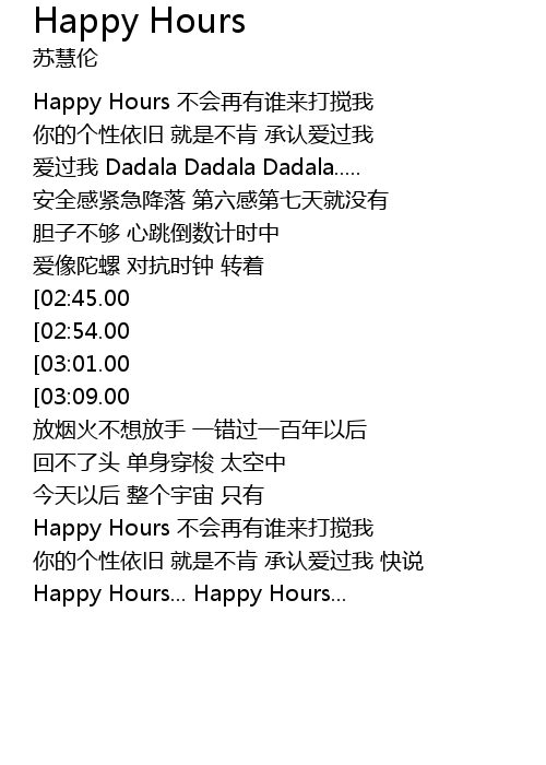| [03:37.00][02:45.00][01:18.00] | Happy Hours 不会再有谁来打搅我 HO.... |