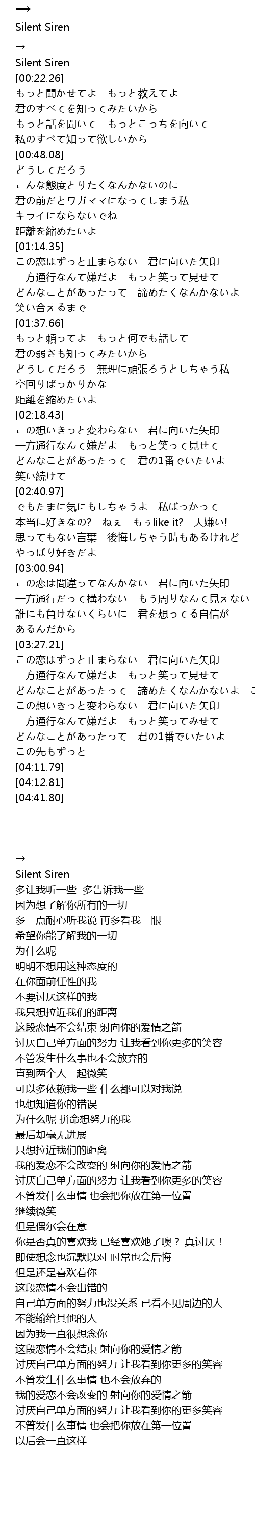 | [02:19.34] | この想いきっと変わらない 君に向いた矢印 |