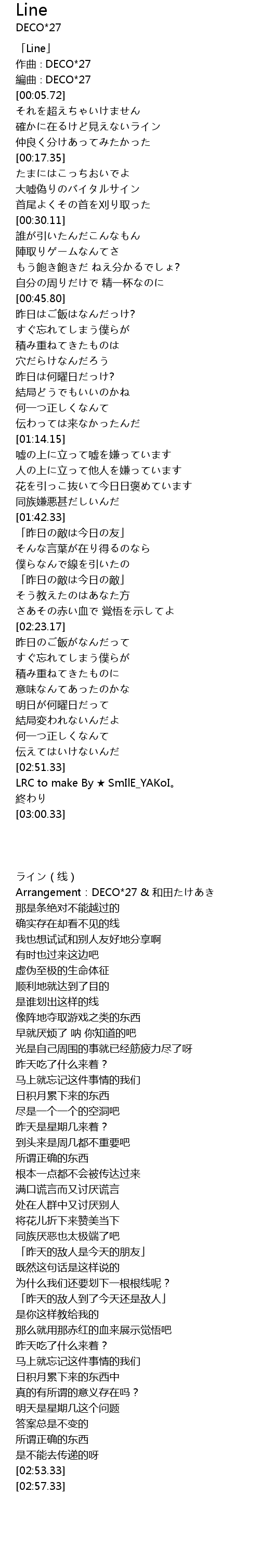 | [00:03.72] | Arrangement:DECO*27 & 和田たけあき |