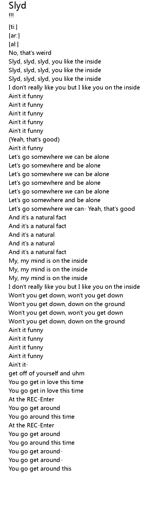 | [00:25.63] | Slyd, slyd, slyd, you like the inside |