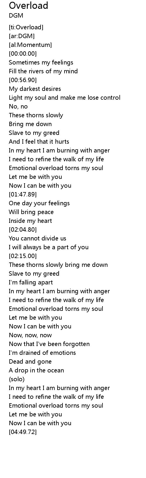 | [04:29.84] | Emotional overload torns my soul |