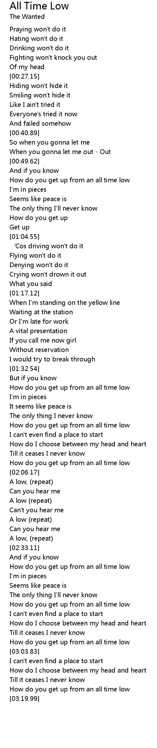 | [03:00.95] | How do you get up from an all time low |