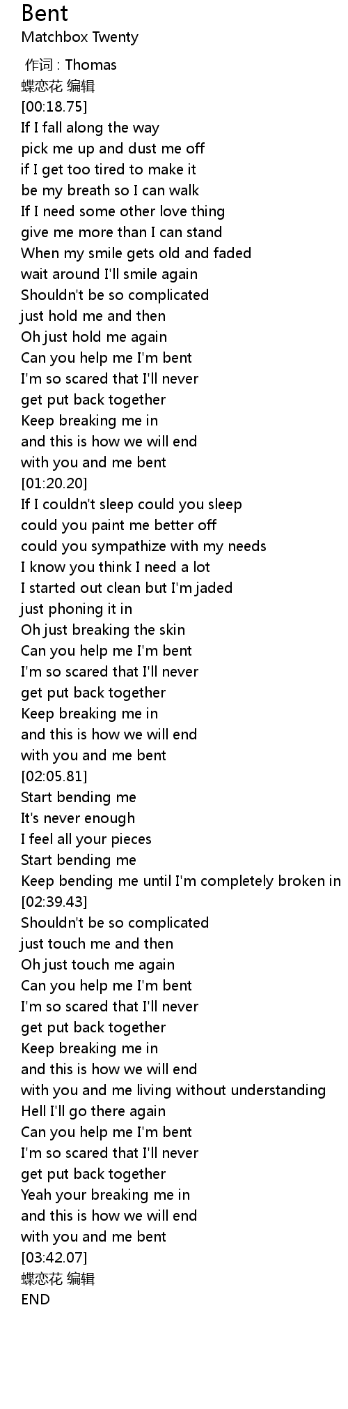 | [02:31.39] | Keep bending me until I'm completely broken in |
