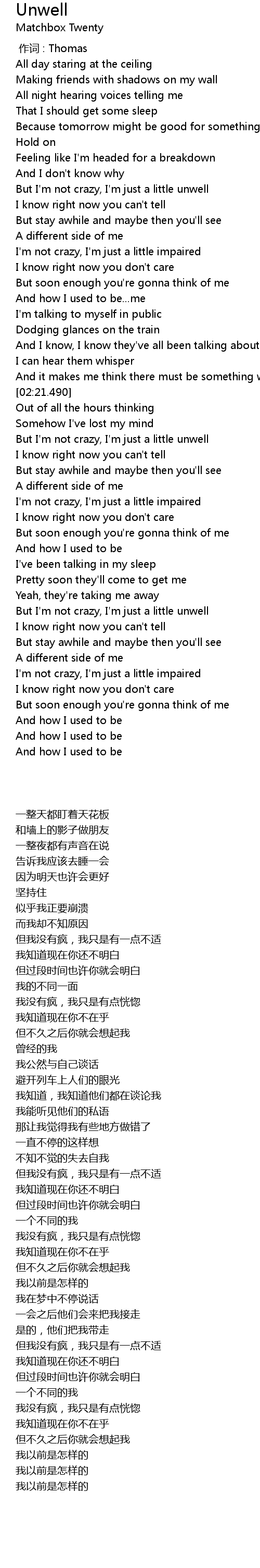 | [01:32.410] | But I'm not crazy, I'm just a little unwell |