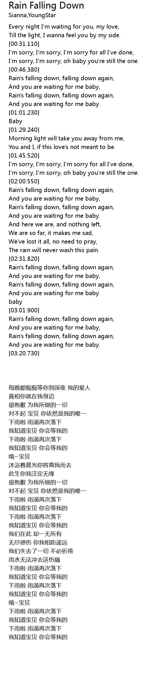 | [03:02.910] | Rain' s falling down, falling down again, |