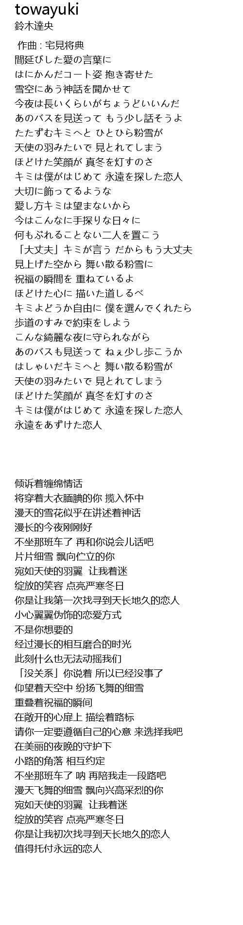 | [01:01.800] | たたずむキミへと ひとひら粉雪が |