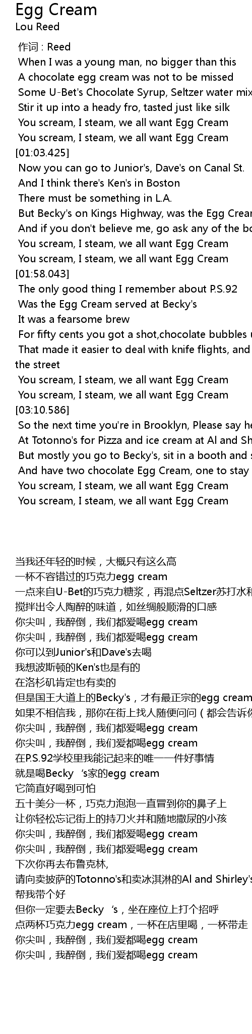 | [00:55.977] | 你尖叫,我醉倒,我们都爱喝egg cream |