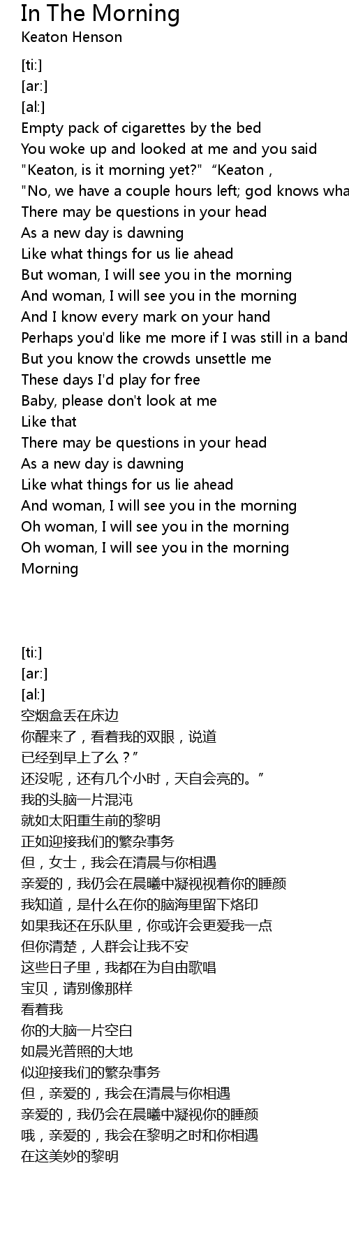 | [00:43.79] | " Keaton, is it morning yet?"" Keaton, |