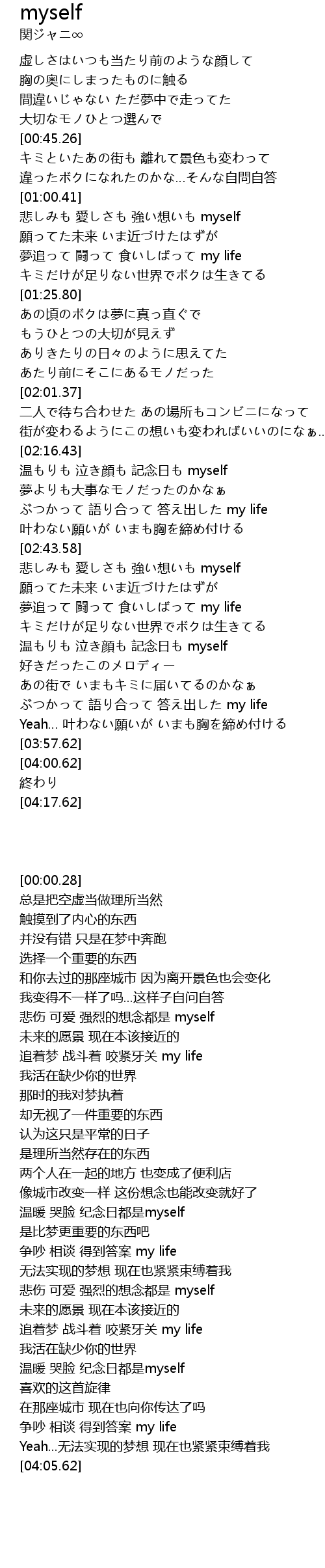 | [02:17.20] | 温もりも 泣き顔も 記念日も myself |