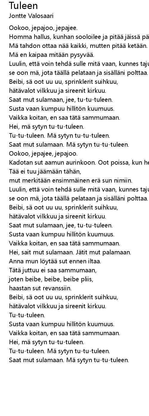 | Tu-tu-tuleen. Mä sytyn tu-tu-tuleen. | |