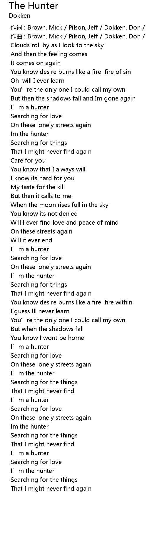 | [00:01.000] | 作曲 : Brown, Mick / Pilson, Jeff / Dokken, Don / Lynch, George |