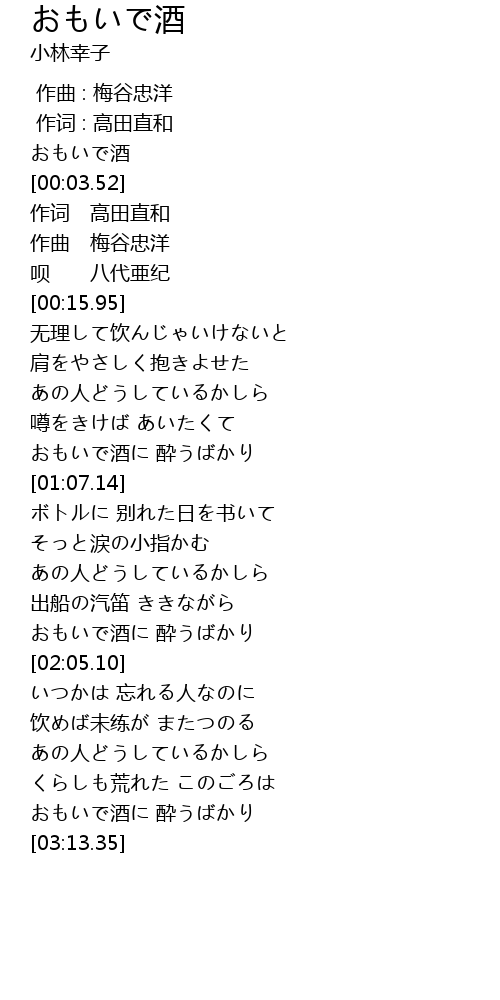 | [01:55.12] | おもいで酒に 酔うばかり |