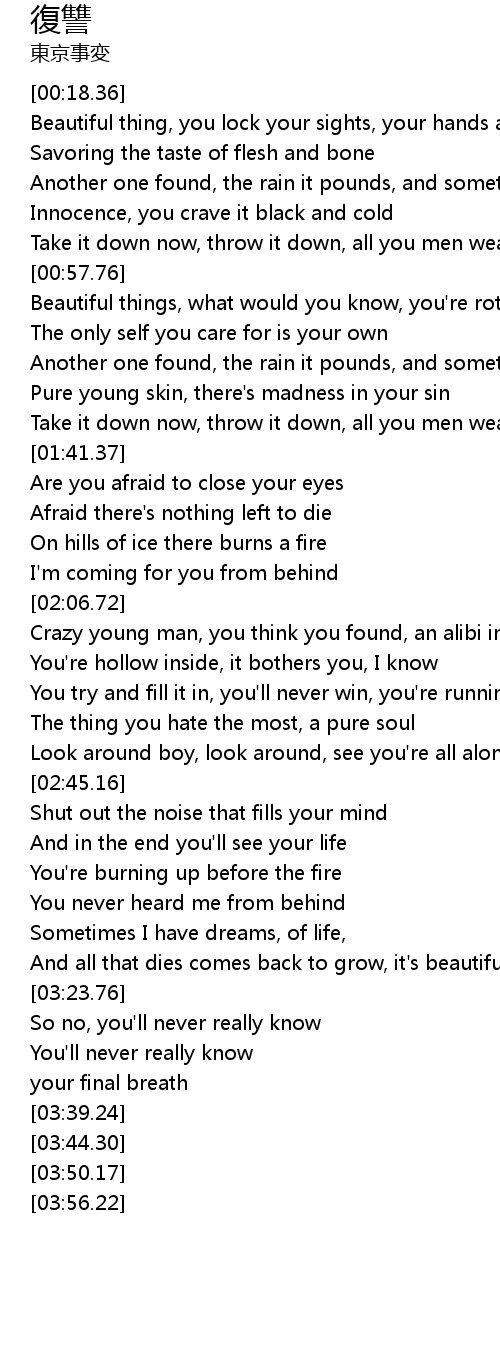 | [00:23.39] | Beautiful thing, you lock your sights, your hands are trembling |