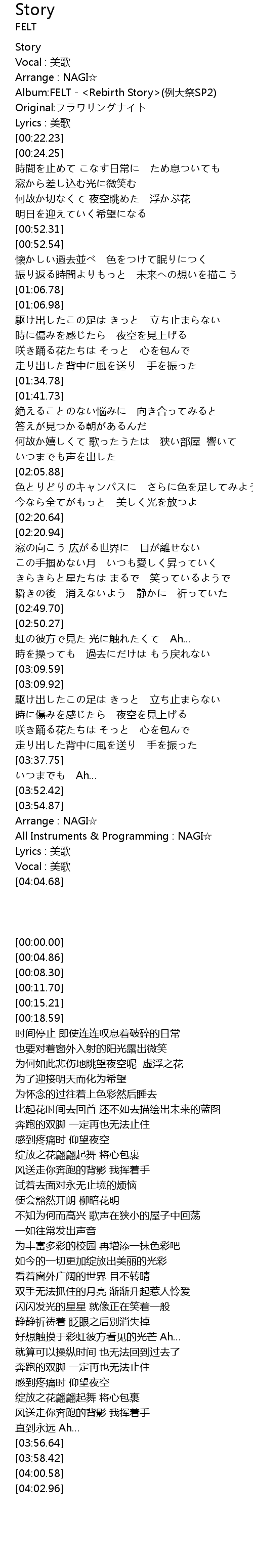 | [00:11.70] | Album:FELT - <Rebirth Story>(例大祭SP2) |