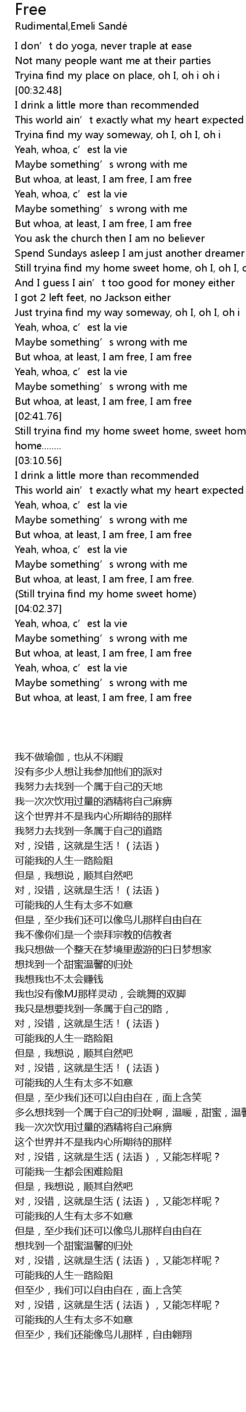 | [01:18.67] | But whoa, at least, I am free, I am free |