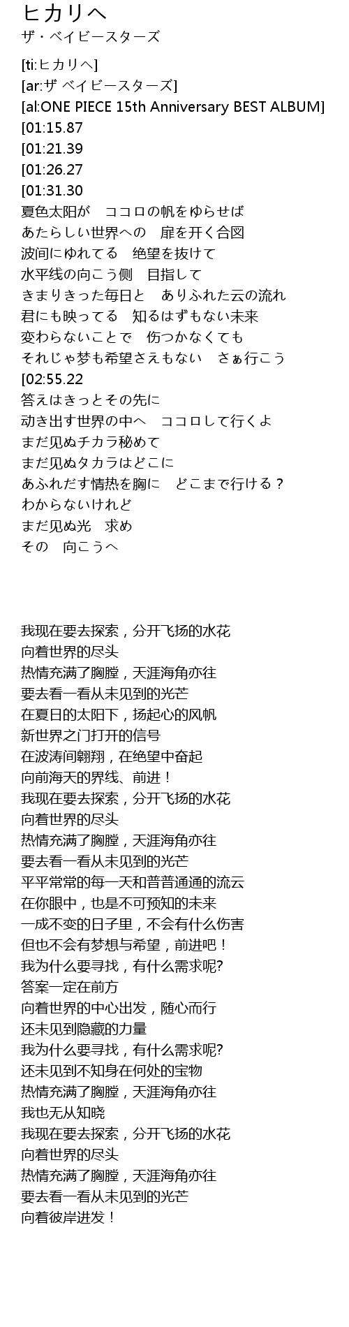 | [00:35.51][01:31.30] | まだ见ぬヒカリ 求め |