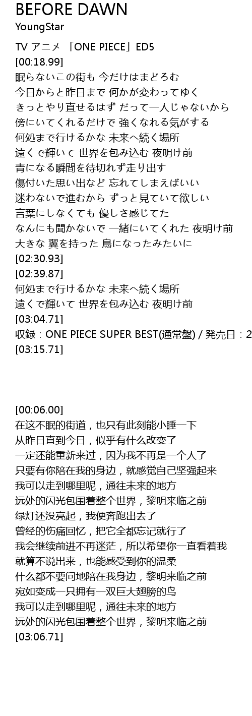 | [00:06.00] | TV アニメ 「ONE PIECE」ED5 |