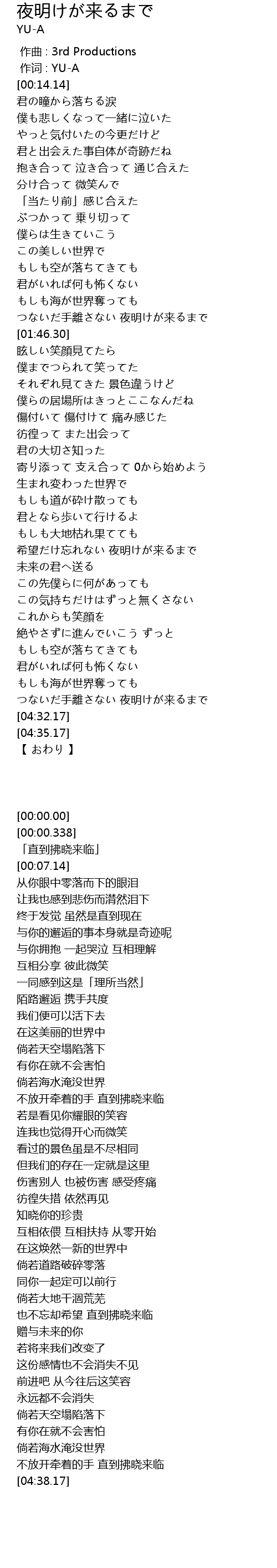 | [01:35.55] | つないだ手離さない 夜明けが来るまで |