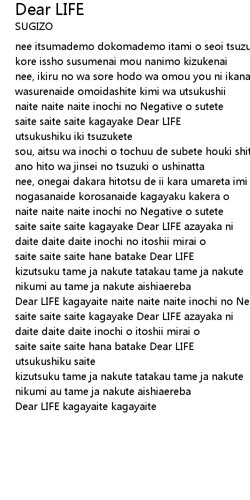 | Dear LIFE kagayaite naite naite naite inochi no Negative o sutete | |