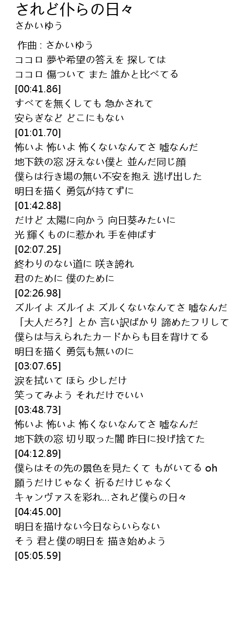 | [04:29.46] | キャンヴァスを彩れ…されど僕らの日々 |