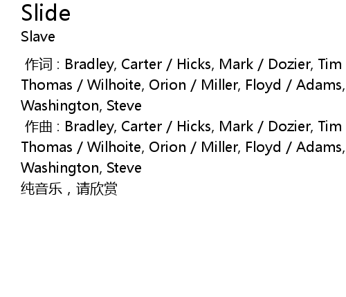 | [00:01.000] | zuo qu : Bradley, Carter Hicks, Mark Dozier, Tim Lockett, Thomas Wilhoite, Orion Miller, Floyd Adams, Mark Webster, Daniel Washington, Steve |