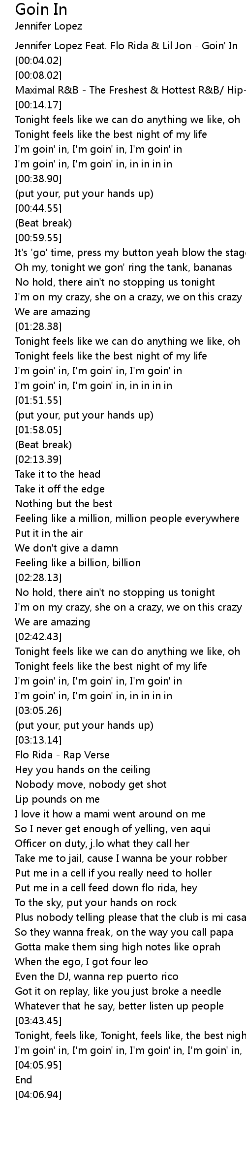 [00:00.02] Jennifer Lopez Feat. Flo Rida & Lil Jon - Goin' In
