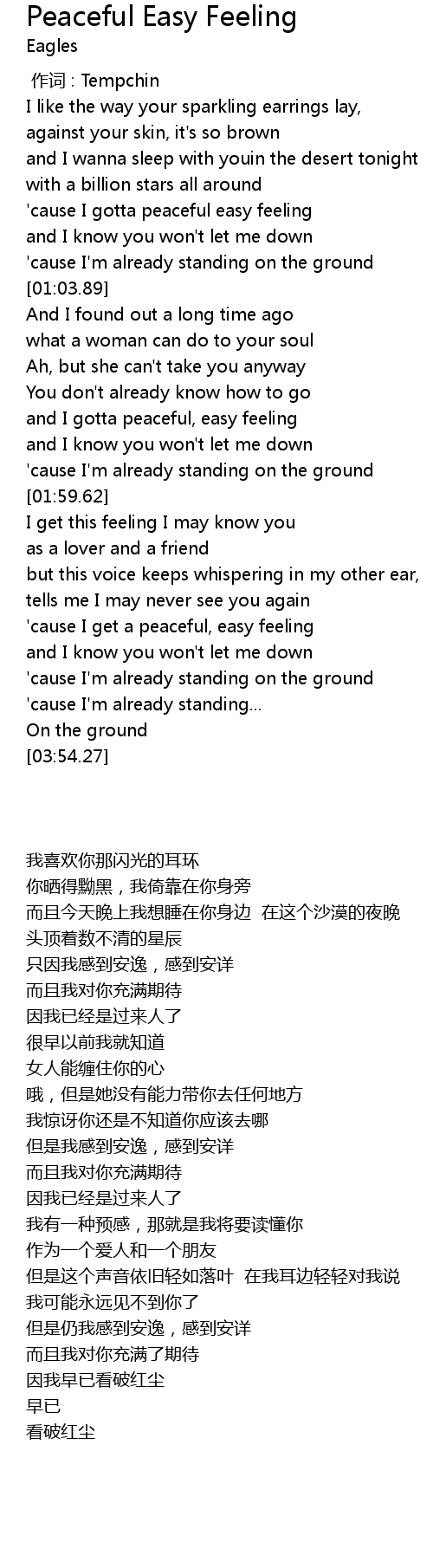 | [00:39.82] | 'cause I gotta peaceful easy feeling |