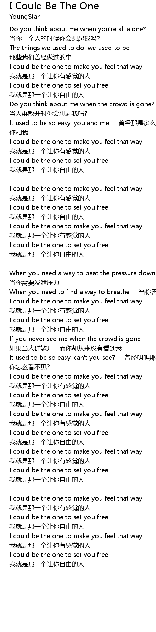 | [04:41.33] | I could be the one to set you free 我就是那一个让你自由的人 |