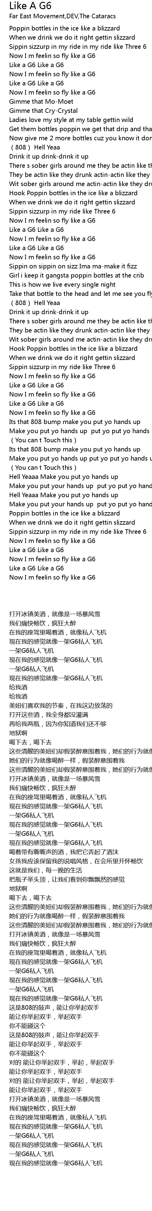 | [00:19.36] | Now I m feelin so fly like a G6 |