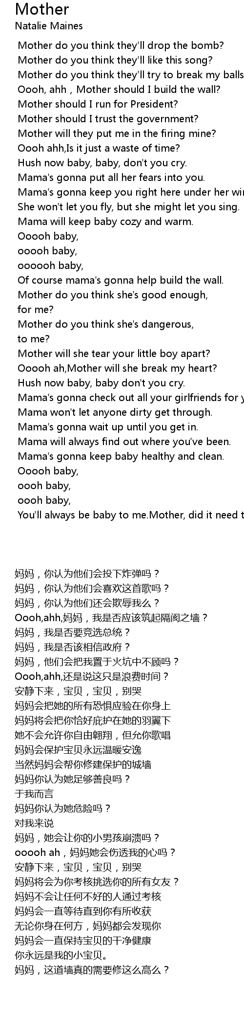 | [00:59.024] | Oooh, ahh,Mother should I build the wall? |
