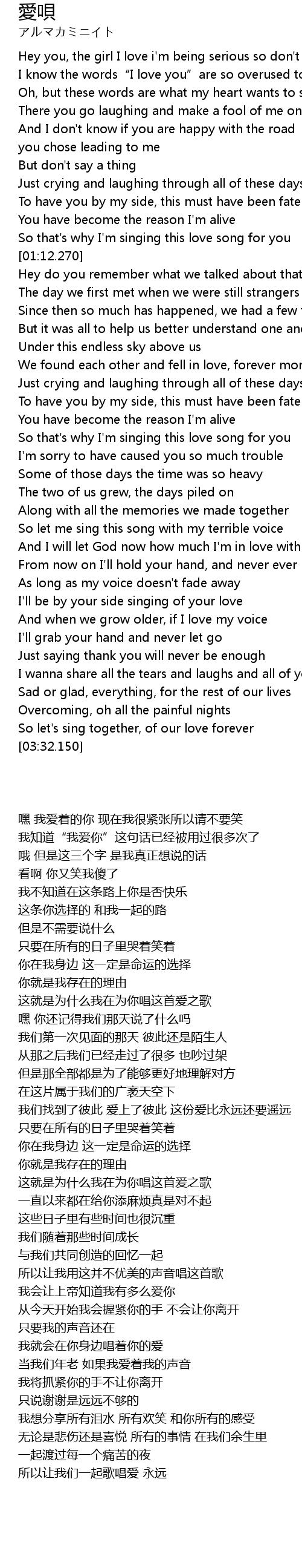 | [03:25.220] | 所以让我们一起歌唱爱 永远 |