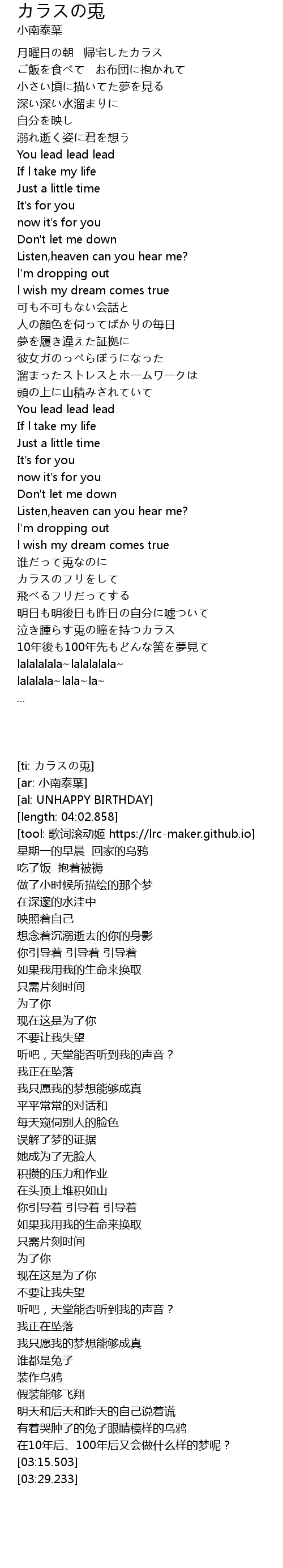 | [02:55.864] | 泣き腫らす兎の瞳を持つカラス |