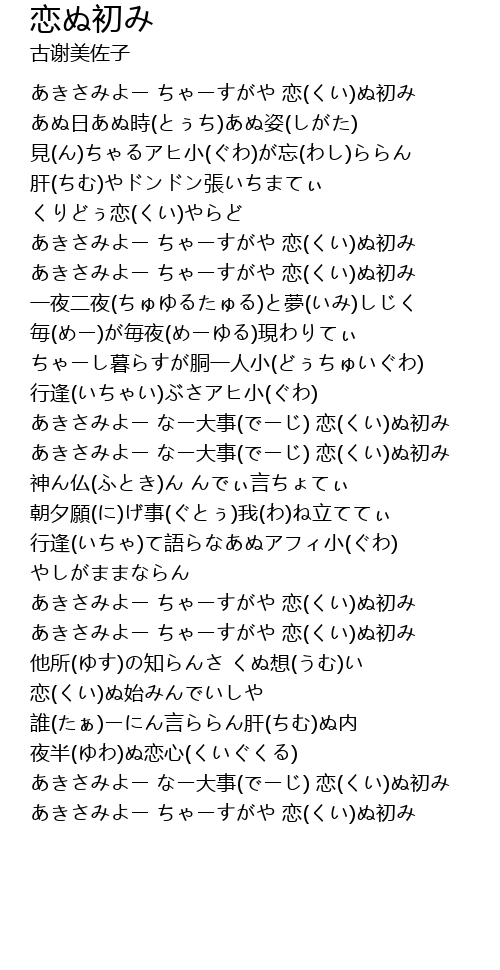 | [03:15.180] | あきさみよー ちゃーすがや 恋(くい)ぬ初み |