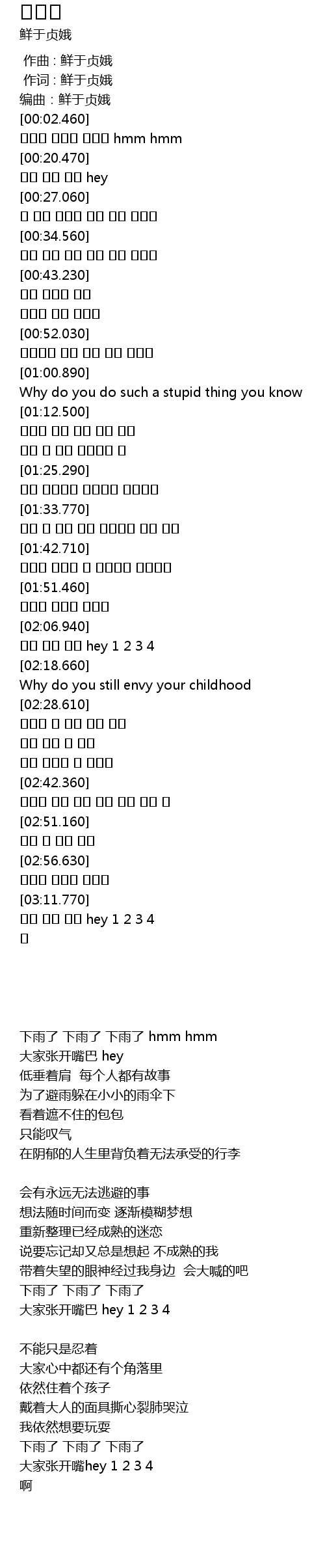 | [00:03.530] | 下雨了 下雨了 下雨了 hmm hmm |