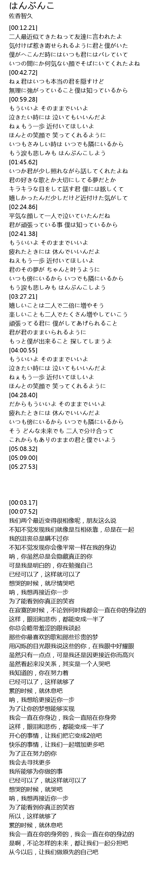 | [03:17.03] | もう涙も悲しみも はんぶんこしよう |