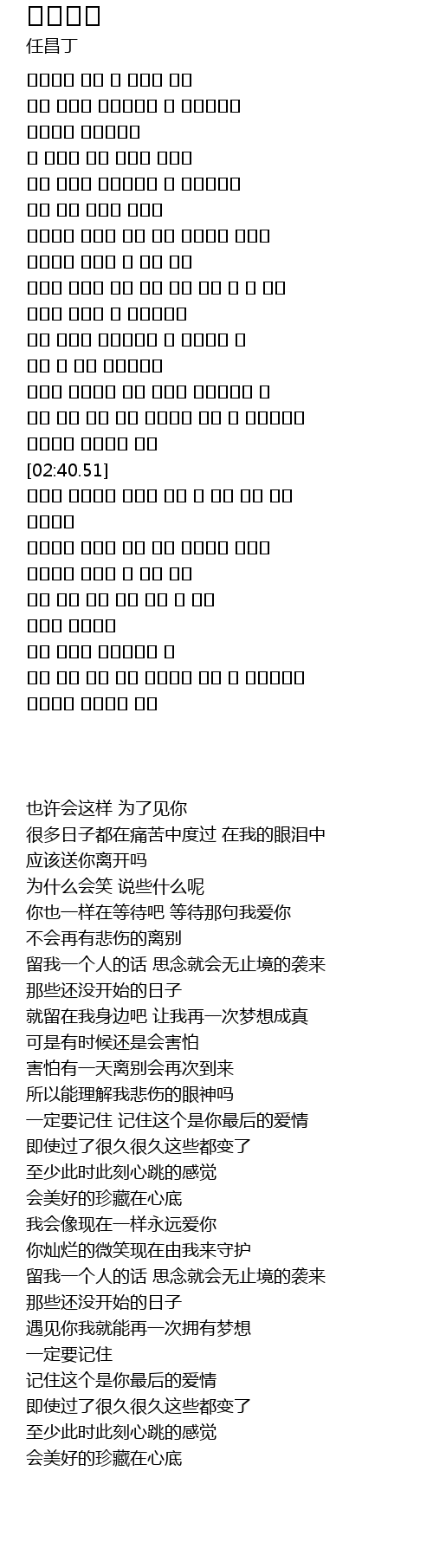 | [02:08.82] | 一定要记住 记住这个是你最后的爱情 |