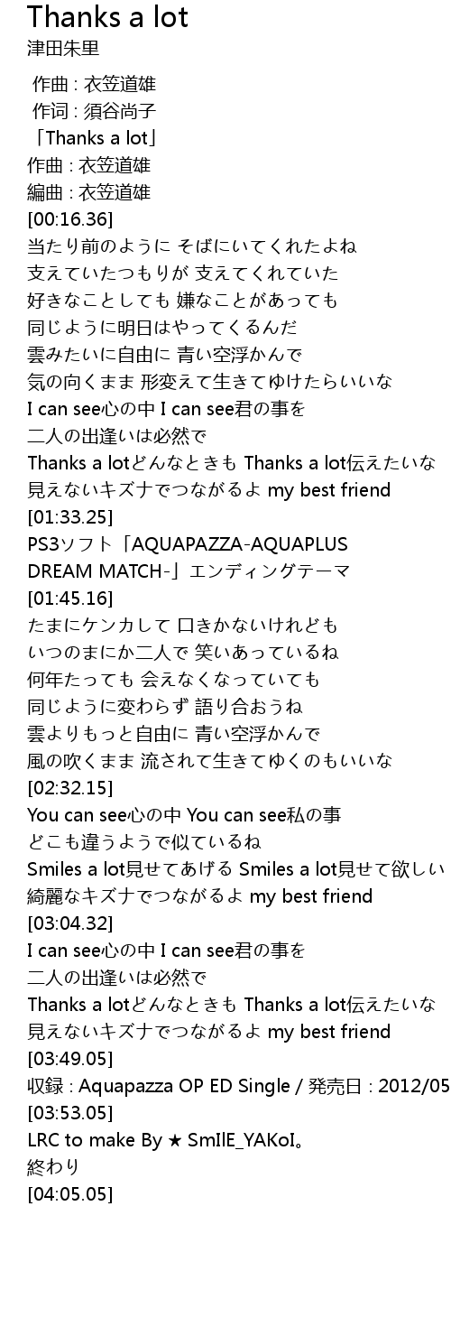 | [01:16.46] | Thanks a lotどんなときも Thanks a lot伝えたいな |