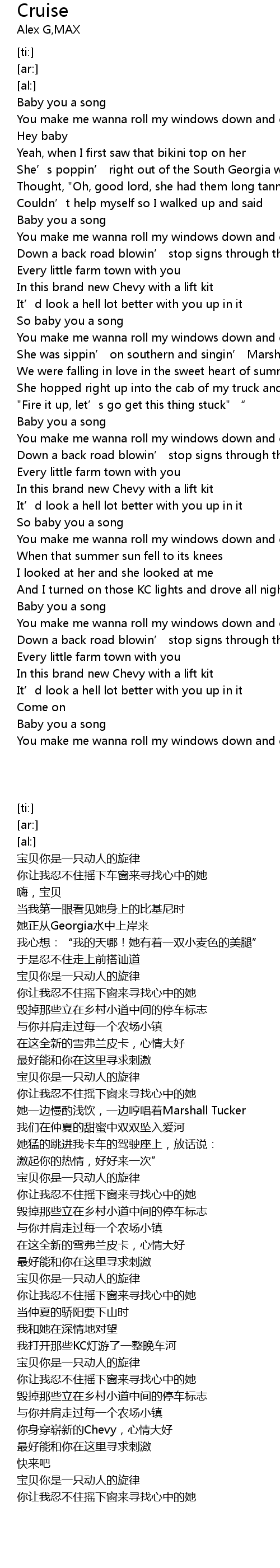 | [00:05.45] | You make me wanna roll my windows down and cruise |