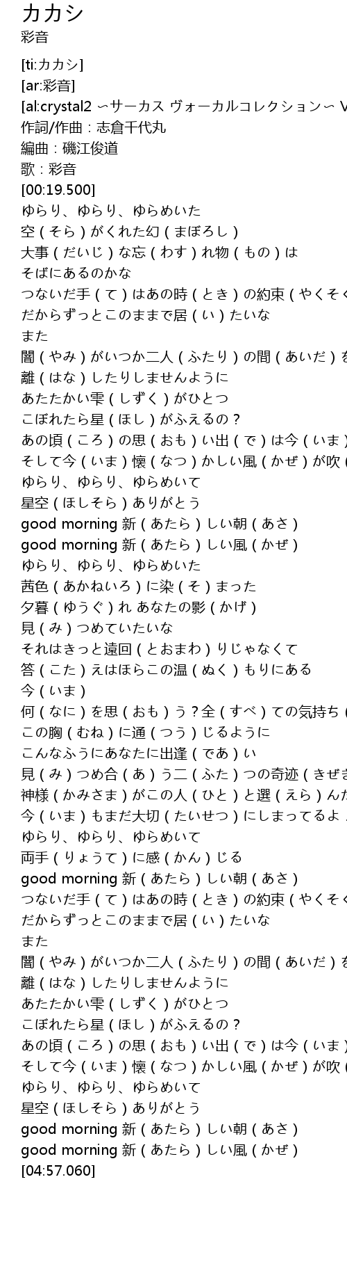 | [04:30.750] | ゆらり、ゆらり、ゆらめいて 星空(ほしそら)ありがとう |