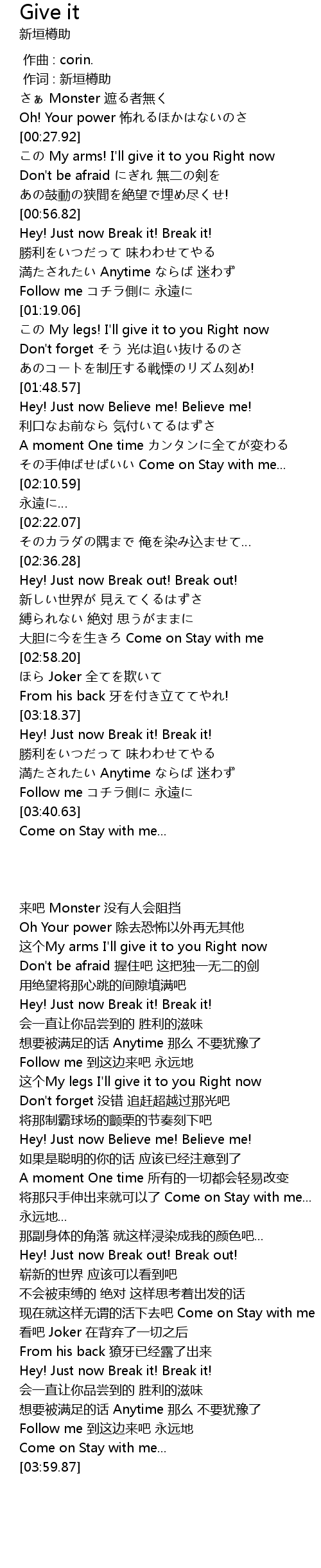 | [03:18.98] | Hey! Just now Break it! Break it! |