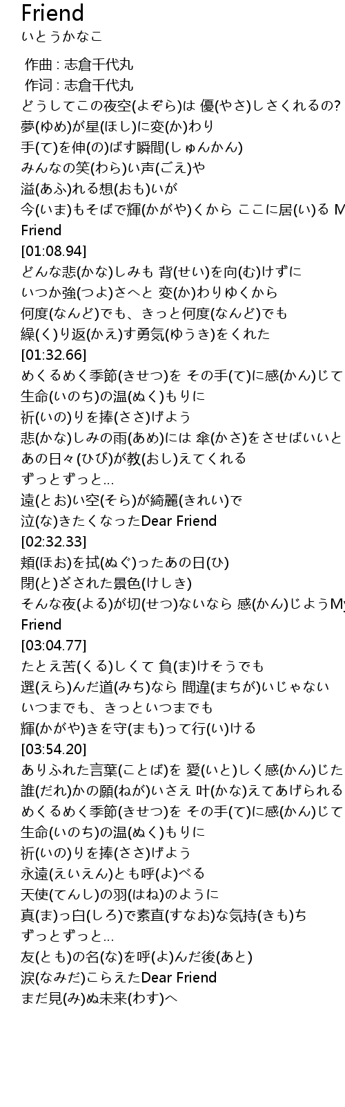 | [00:57.39] | 今(いま)もそばで輝(かがや)くから ここに居(い)る My Friend |