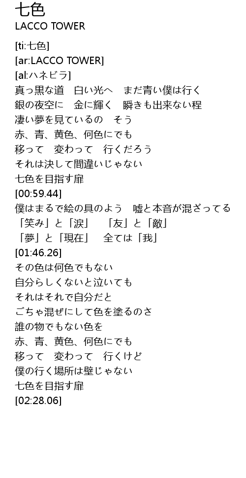 | [00:56.15] | 七色を目指す扉 |