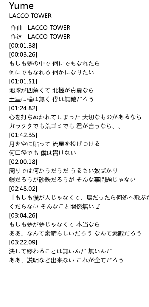 | [00:00.346] | 作词 : LACCO TOWER |