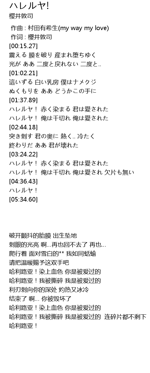 | [04:17.23] | ハレルヤ! 俺は千切れ 俺は愛され 欠片も無い |