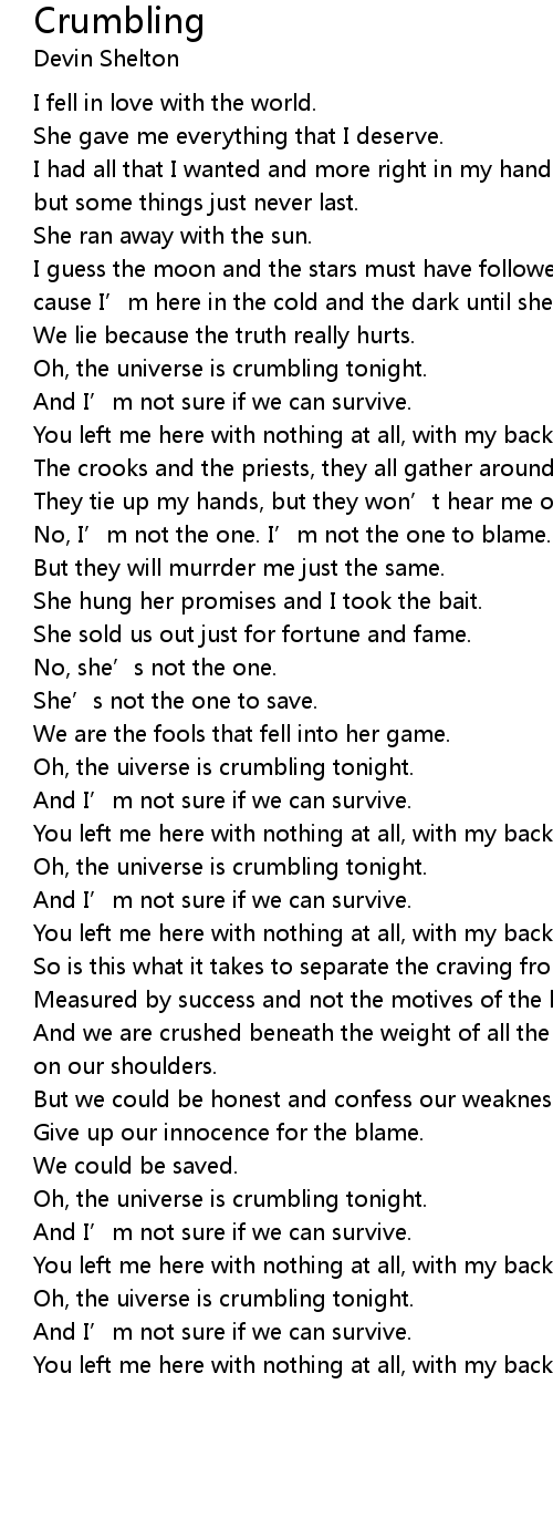 | [02:16.87] | Oh, the universe is crumbling tonight. |