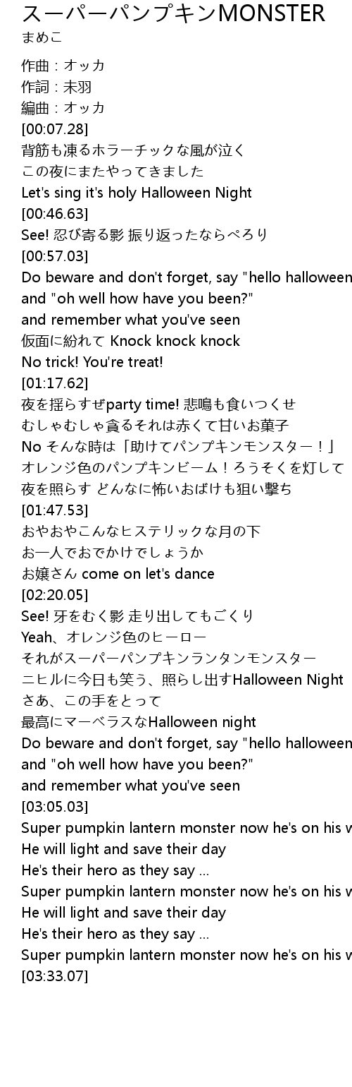 | [03:05.81] | Super pumpkin lantern monster now he's on his way |