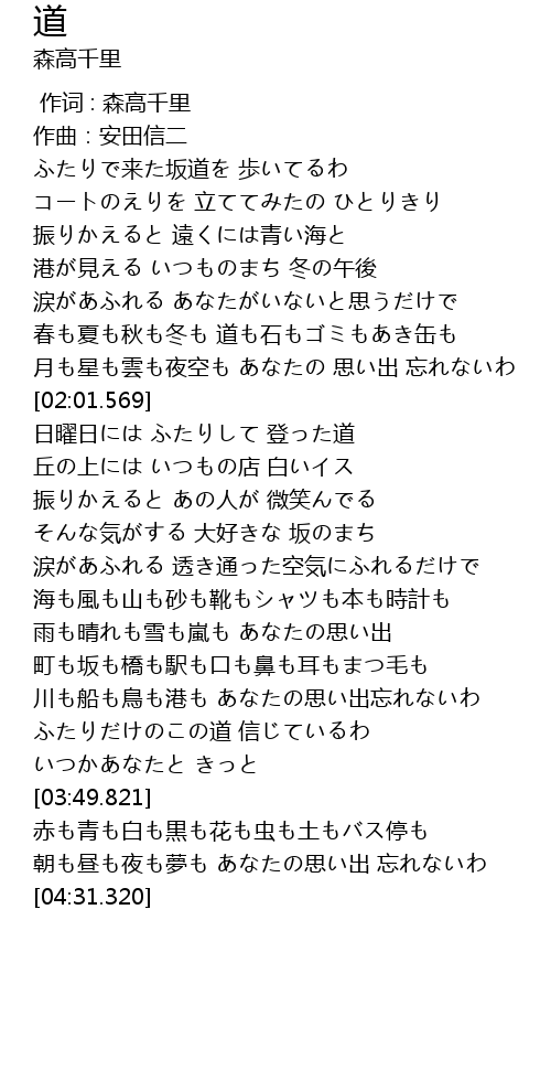 | [02:04.062] | 日曜日には ふたりして 登った道 |
