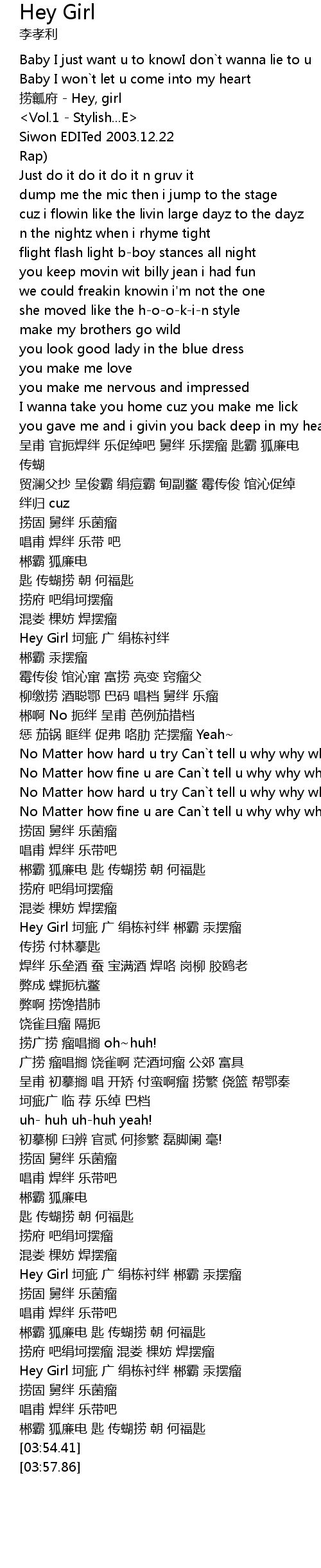 [03:19.81] Hey Girl kě cī guǎng juàn dòng chèn bàn chēn bà gǒng bǎi liú