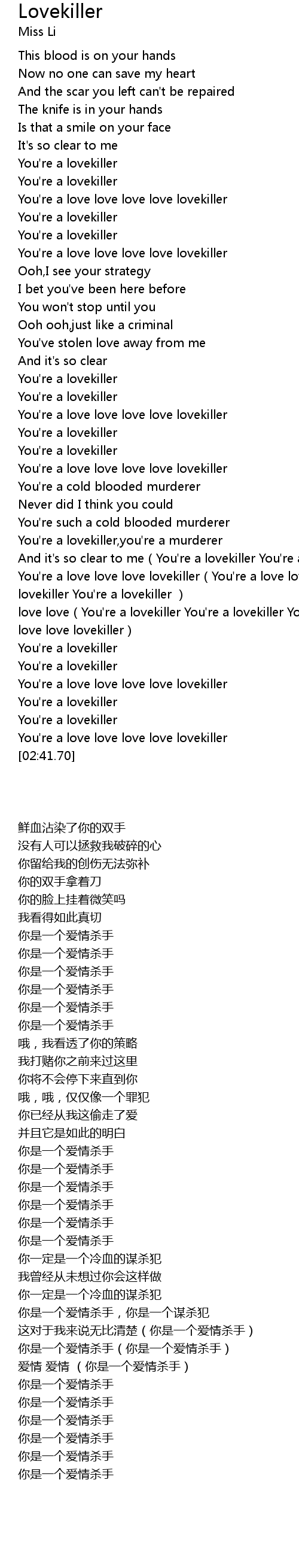 | [02:17.72] | love love You' re a lovekiller You' re a lovekiller You' re a love love love love lovekiller |